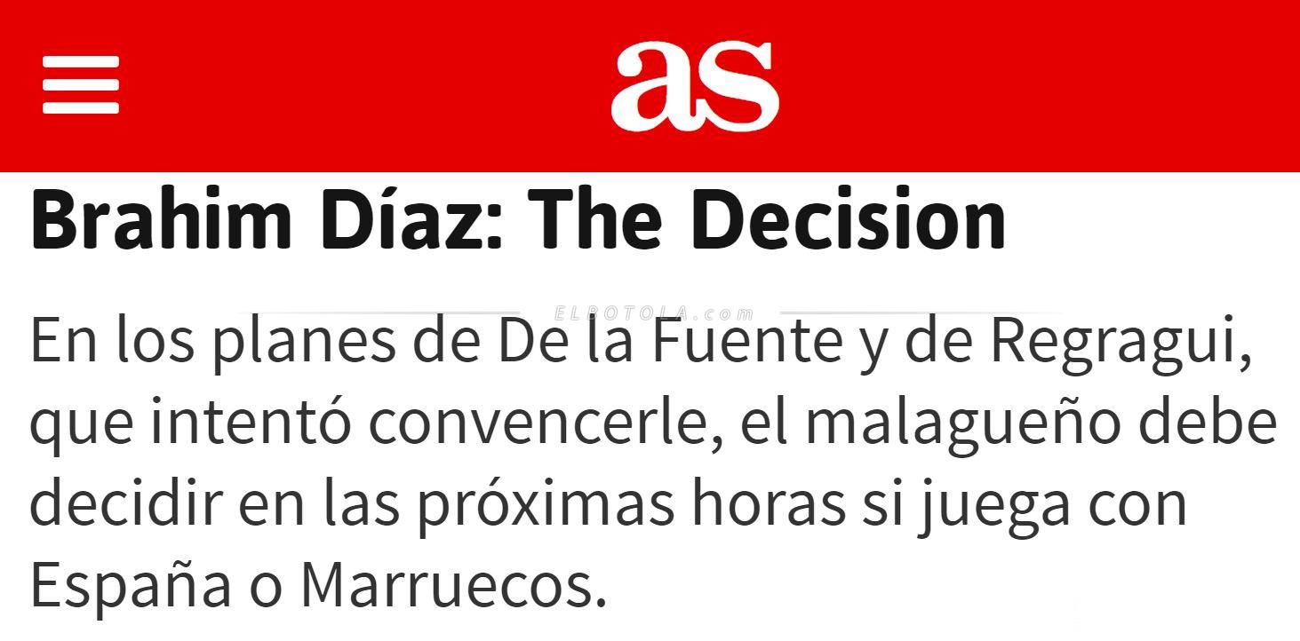 وكتبت الصحيفة: "ساعات حاسمة لمعرفة ما إذا كان إبراهيم دياز سيلعب مع إسبانيا أم مع المغرب. اللاعب في خطط كل من 'لاروخا' و'أسود الأطلس'، ويأمل أن يستدعيه دي لا فوينتي للمباريات ضد النرويج واسكتلندا، لكن إذا لم يحدث ذلك، ربما سينتهي به الأمر باللعب مع البلد الذي ولد فيه والده"، في إشارة إلى أن متوسط ميدان الإيطالي، يعطي الأولوية لـ.