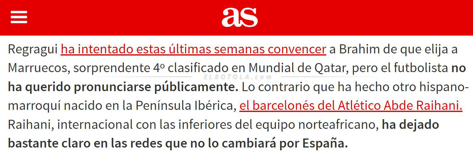 ودائما حسب "آس" فإن ، حاول في الأسابيع الأخيرة "إقناع إبراهيم باختيار المغرب، لكن اللاعب لم يرغب في التحدث عن ذلك علنًا، على عكس ما فعله مغربي إسباني آخر، لاعب أتلتيكو عبد الله ريحاني، الذي أوضح عبر مواقع التواصل الاجتماعي، أنه لن يغير جنسيته الرياضية واللعب مع إسبانيا".