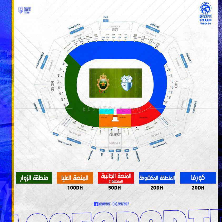 هذا وحددت إدارة الفريق الأزرق ثمن التذاكر في 20 درهما لـ"الكورفا" والمنطقة المكشوفة، و50 درهم للمنصة الجانبية و100 درهم للمنصفة العليا.